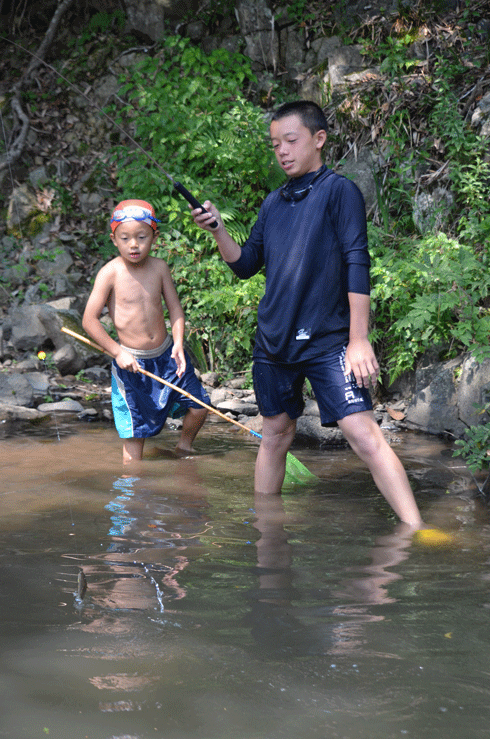 と遠くで竿をしならせる次男。